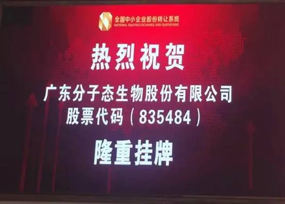 2016年4月6日,廣東分子態(tài)生物股份有限公司舉行正式掛牌儀式,股票簡(jiǎn)稱“分子態(tài)”,是中國(guó)首家分子植提上市企業(yè),股票代碼:835484。分子態(tài)董事長(zhǎng)周粵生以及公司各級(jí)高層領(lǐng)導(dǎo)出席掛牌儀式,隨著上市鐘聲宏亮的響起,他們共同見證了分子態(tài)上市這一輝煌時(shí)刻。至此,分子態(tài)將站在歷史的新高點(diǎn),迎來跨越發(fā)展的重大機(jī)遇。