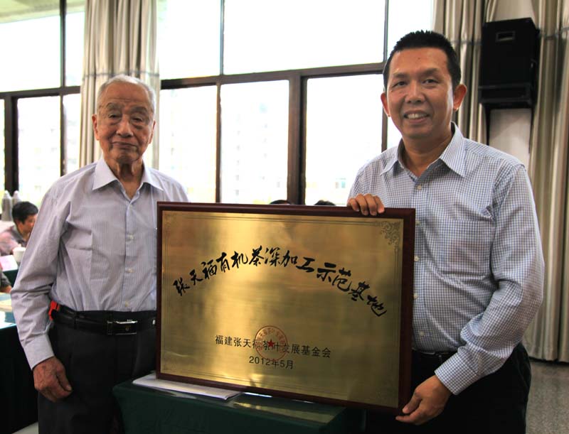 在剛剛舉行的張?zhí)旄2枞~發(fā)展基金會(huì)換屆大會(huì)上,104歲茶圣張?zhí)旄ⅰ皬執(zhí)旄S袡C(jī)茶深加工示范基地”授予正源華茶,這是張老在指導(dǎo)建設(shè)了五個(gè)有機(jī)茶種植示范基地之后,建設(shè)的唯一一個(gè)有機(jī)茶深加工示范基地,寄托了張老對(duì)有機(jī)茶深加工的殷切期望。